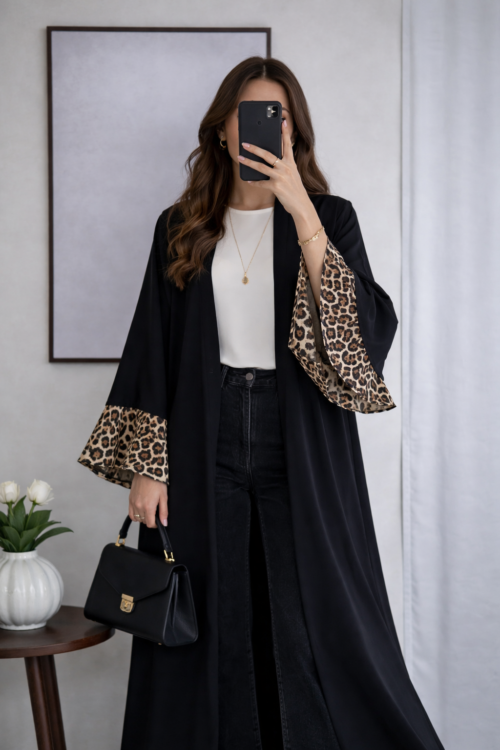 Black Open Abaya with Leopard Print