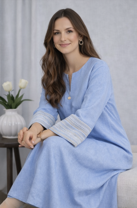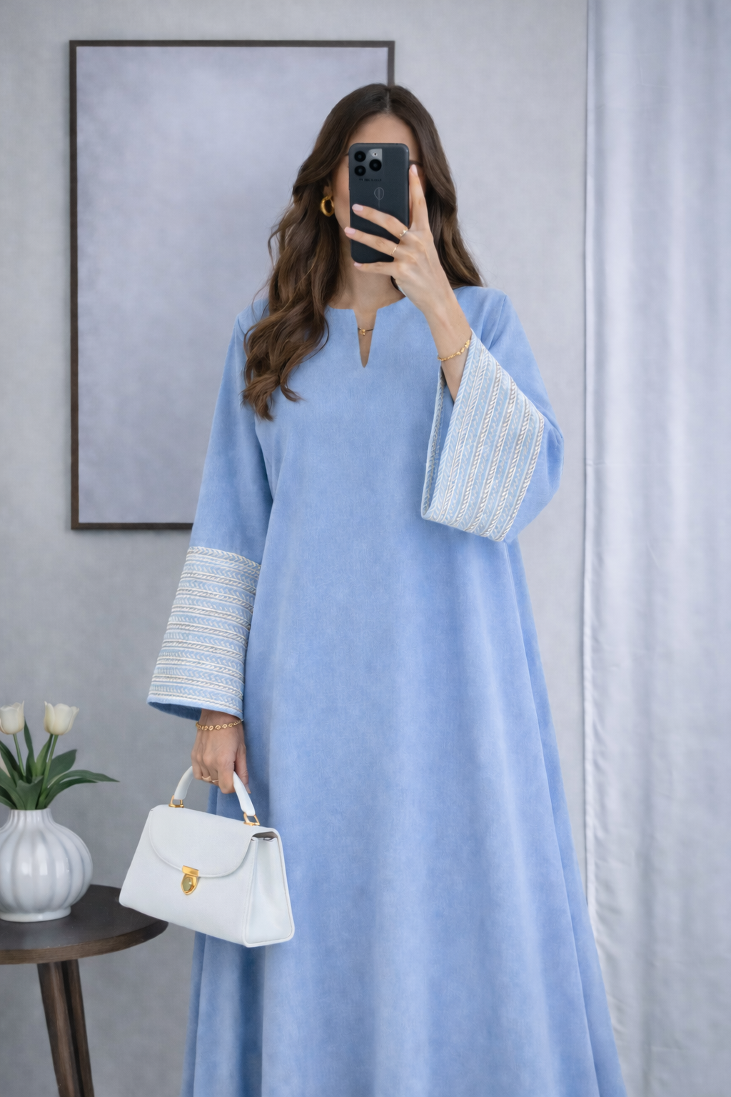 Soft and serene, this closed light blue abaya brings a refreshing touch to your wardrobe, elevated by a distinctive sleeve design that adds elegance and detail. The gentle hue pairs beautifully with the clean, flowing silhouette, making it a graceful choice for both casual and refined occasions. With a discreet in-seam pocket this abaya comes with a belt for a more fitted look.